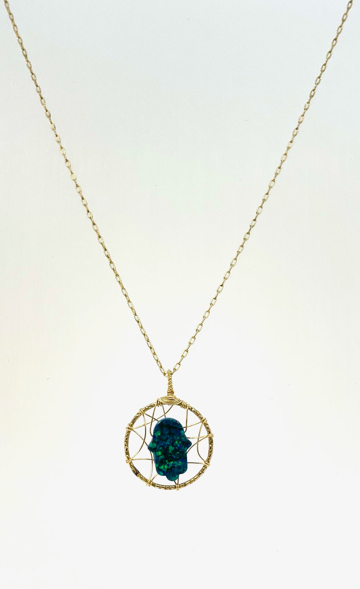 Dream Catcher Necklace with Opal Hamsa, Gold Filled, Dark Opal Hamsa - 18" Chain